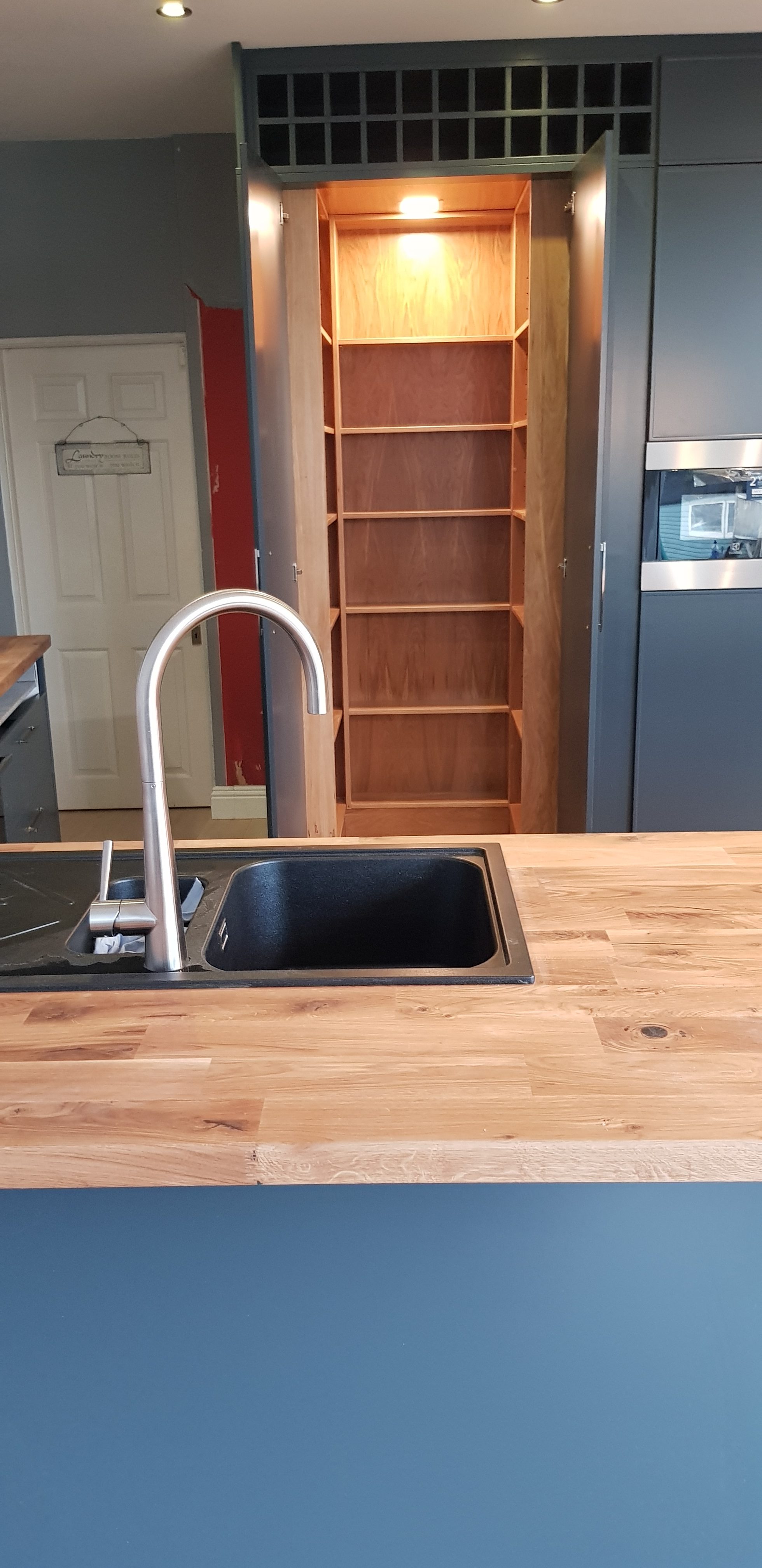 The doors are a landmark of excellence is an understatement to describe the finesse of post-modern epic design. The anthracite colour sets these doors apart from the rest and a striking contrast to the solid oak worktop and the oak walk in larder.