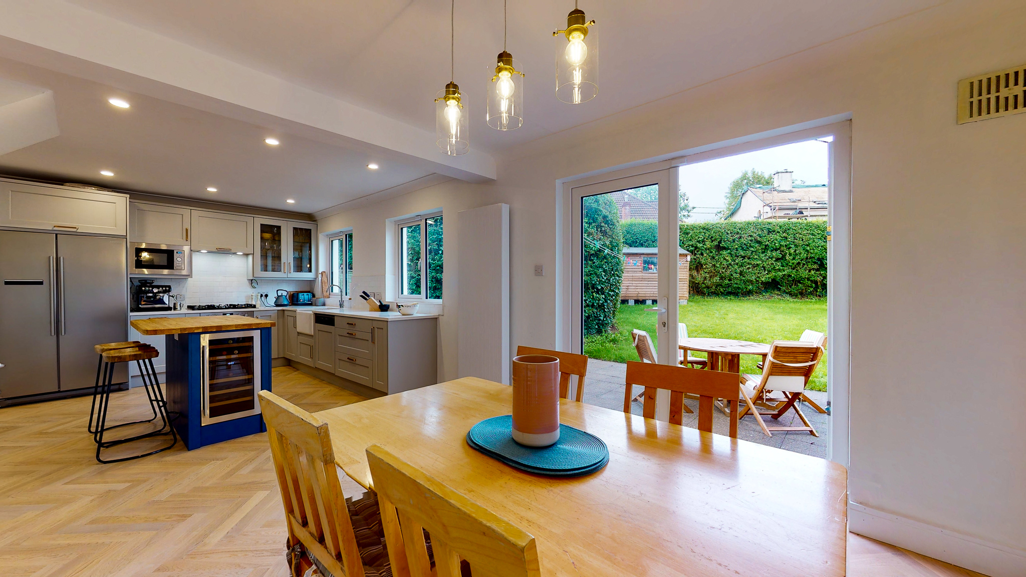 A recent job in Blanchardstown with a new kitchen design and house renovation in Dublin. The kitchen consists of a two tone light grey for the main kitchen area and a quay blue for the island which has a solid oak worktop and a wine cooler.
