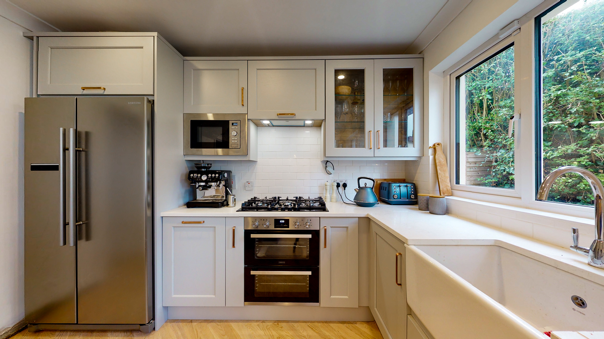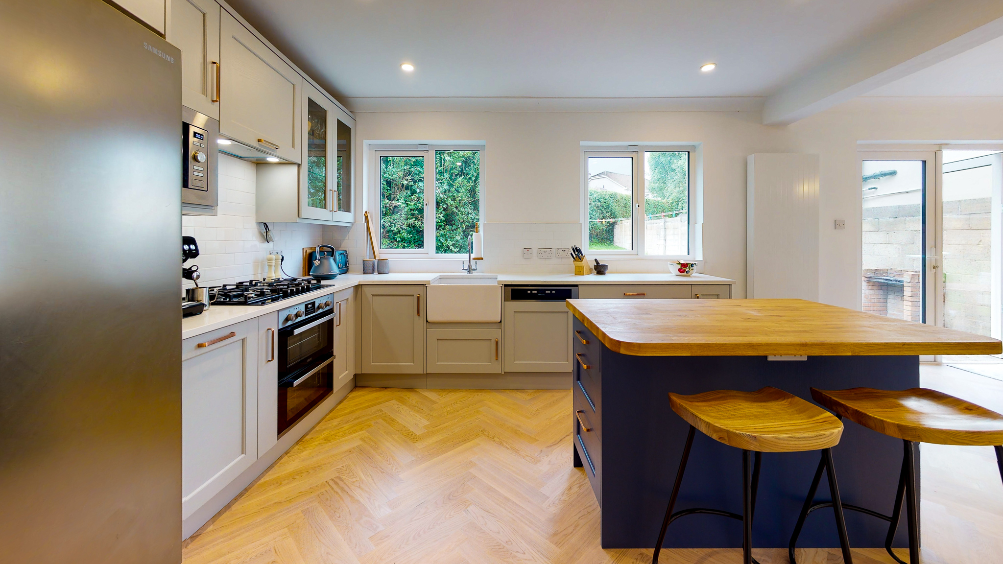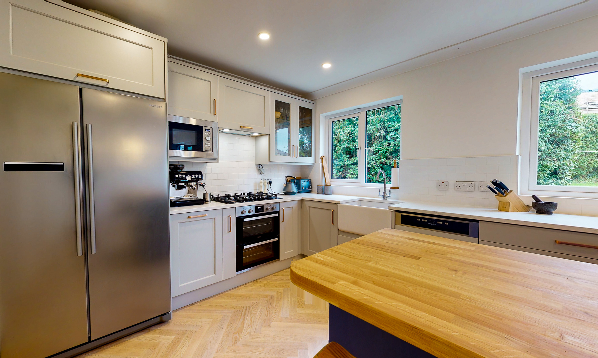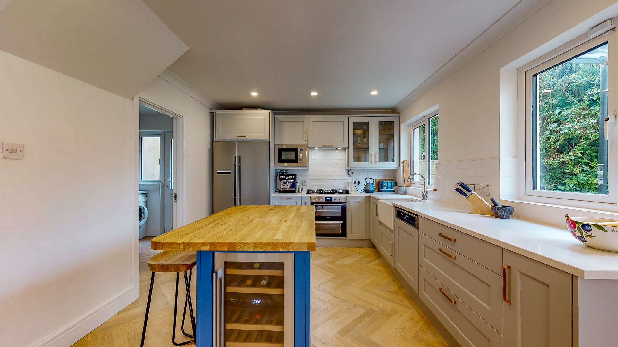 The main kitchen has quartz worktops from Stone Solutions in Wexford who done a beautiful job. The Belfast sink and taps, extractor are from Caple with a integrated microwave, American fridge, integrated bins, 3 drawer packs, le mans unit, integrated dishwasher and 900 tall wall units with clear glass.