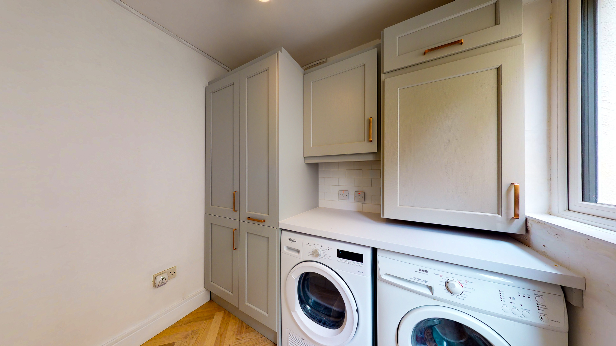 The utility room has a tall pull out larder with a tall broom unit. boiler housing and wall units with the washing matching and dryer below.