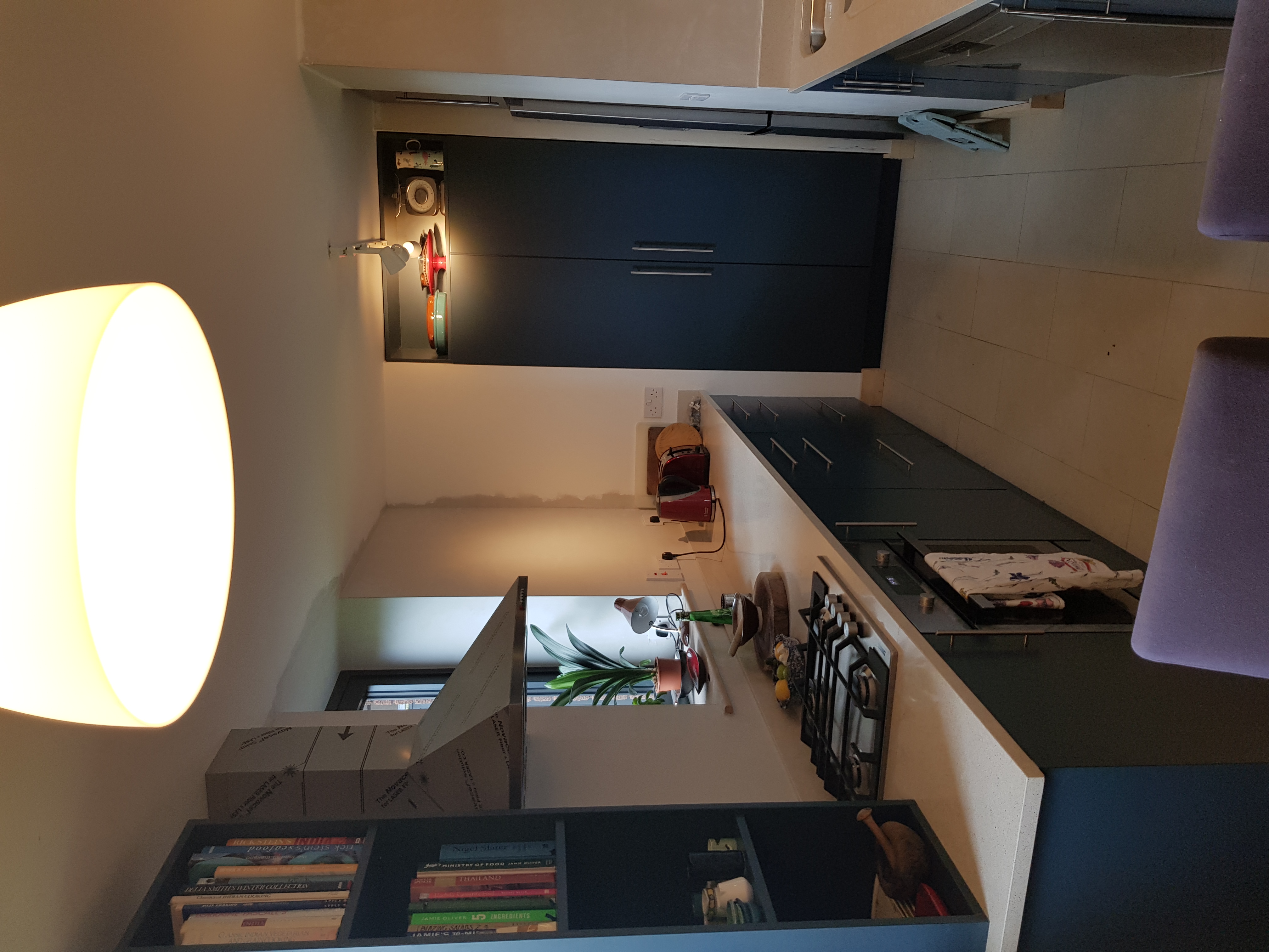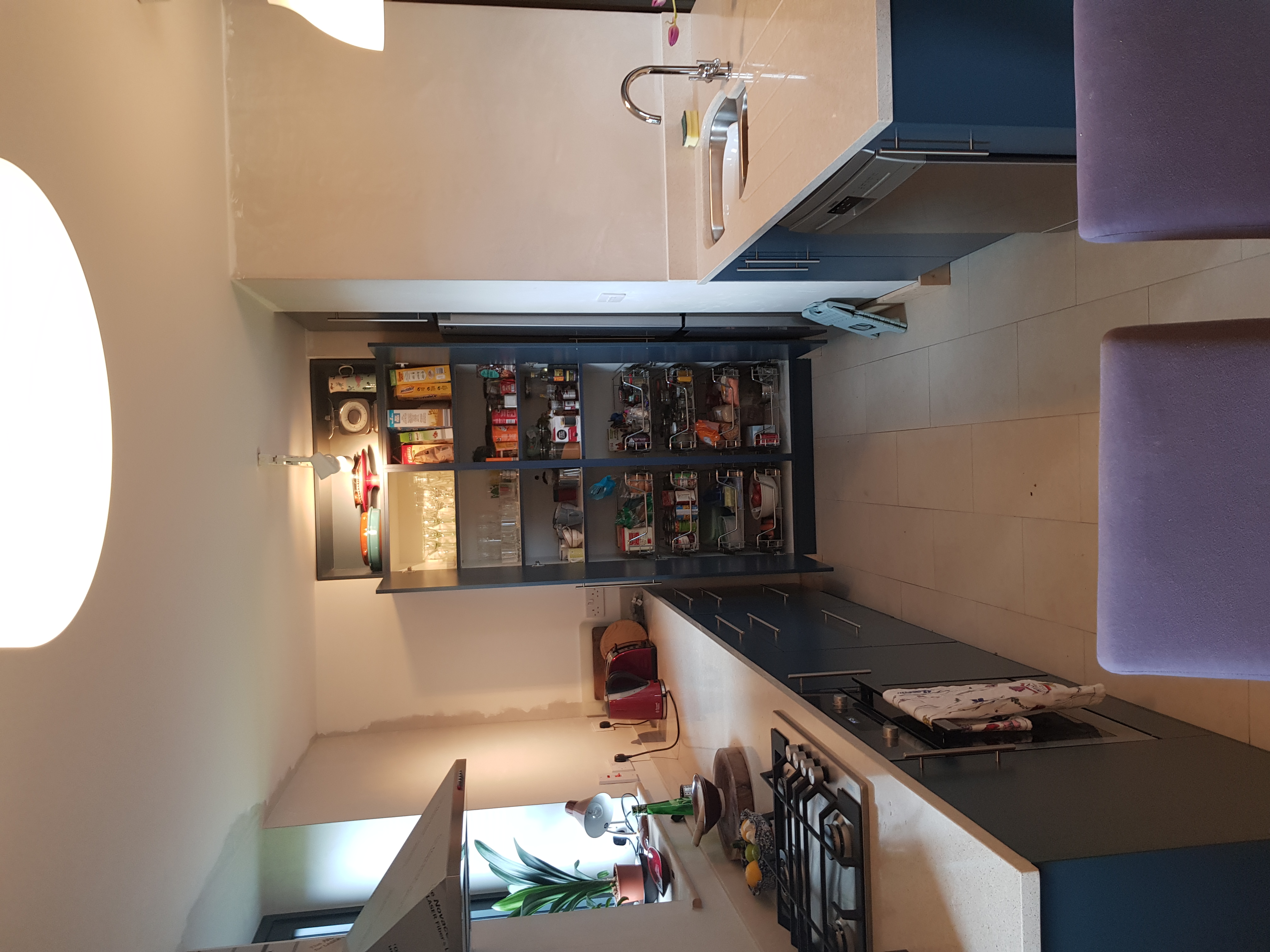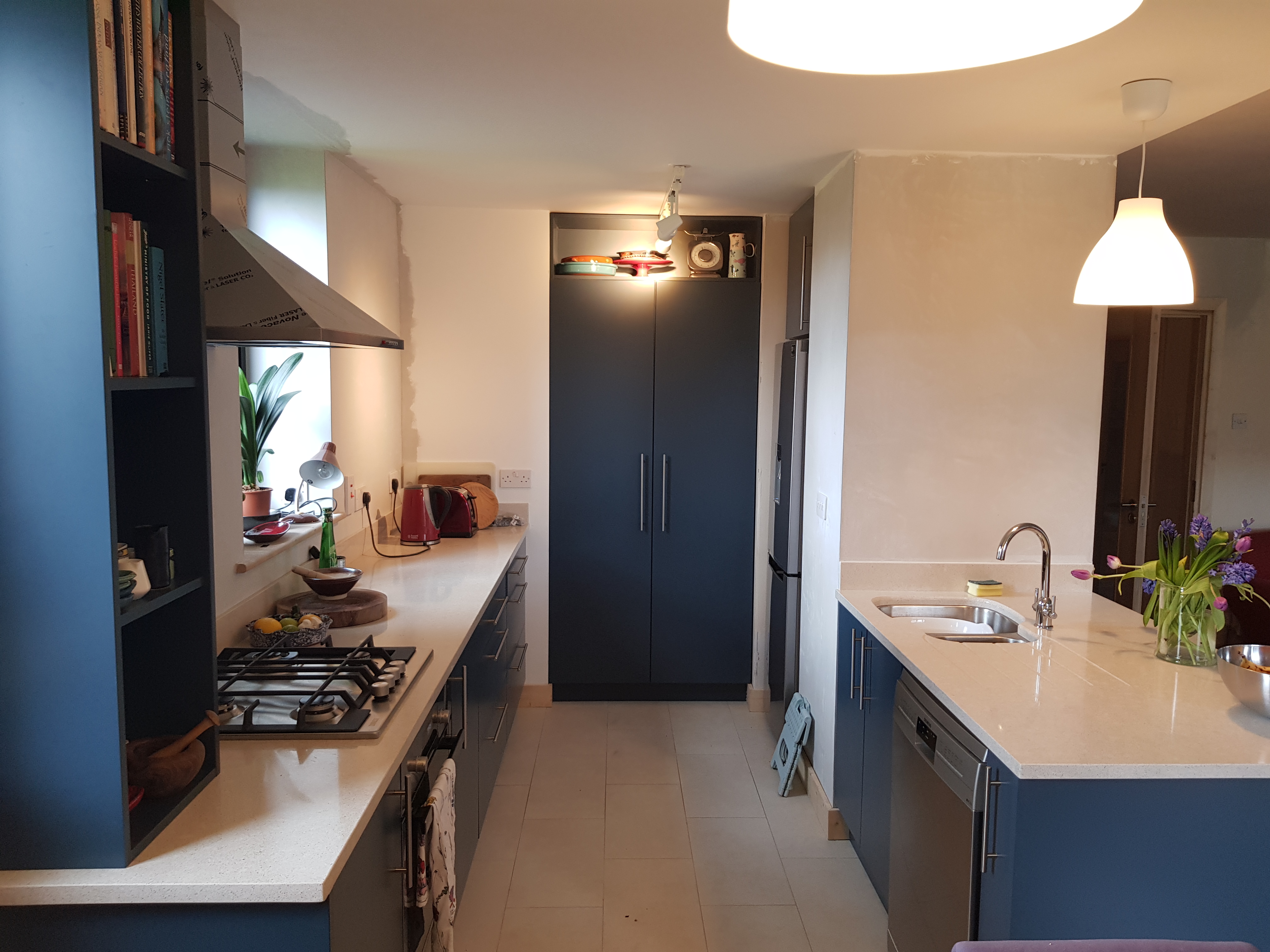 A Dalkey bespoke fitted kitchen Modern Form Kitchens fitted in March 2018. The doors are sprayed in a custom Farrow and Ball blue with a granite worktop from Stone Solutions in Wexford.