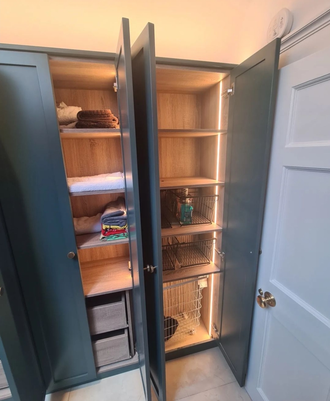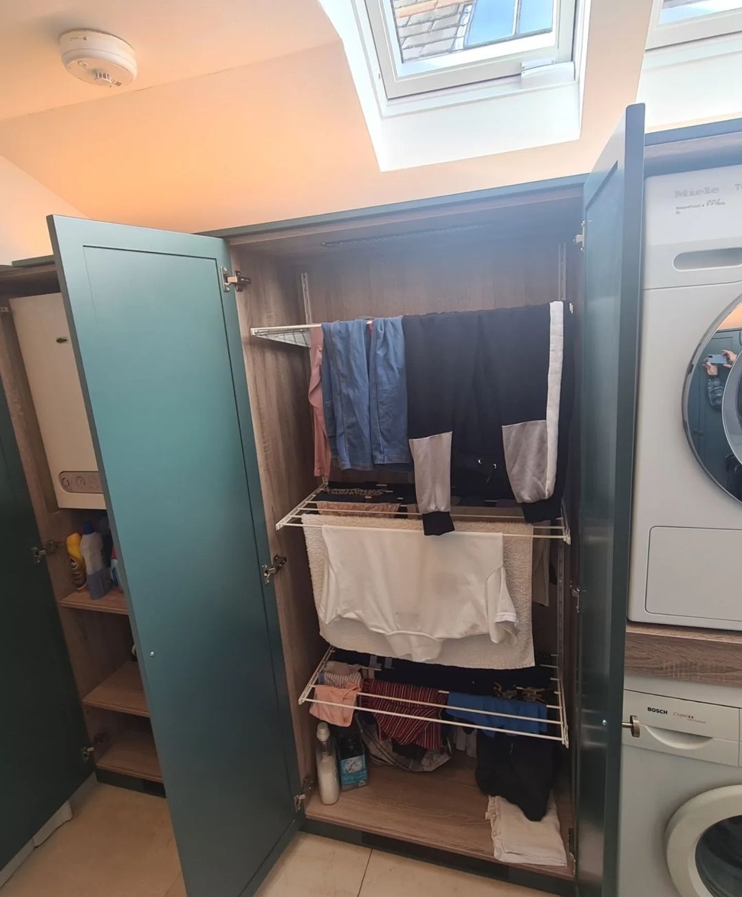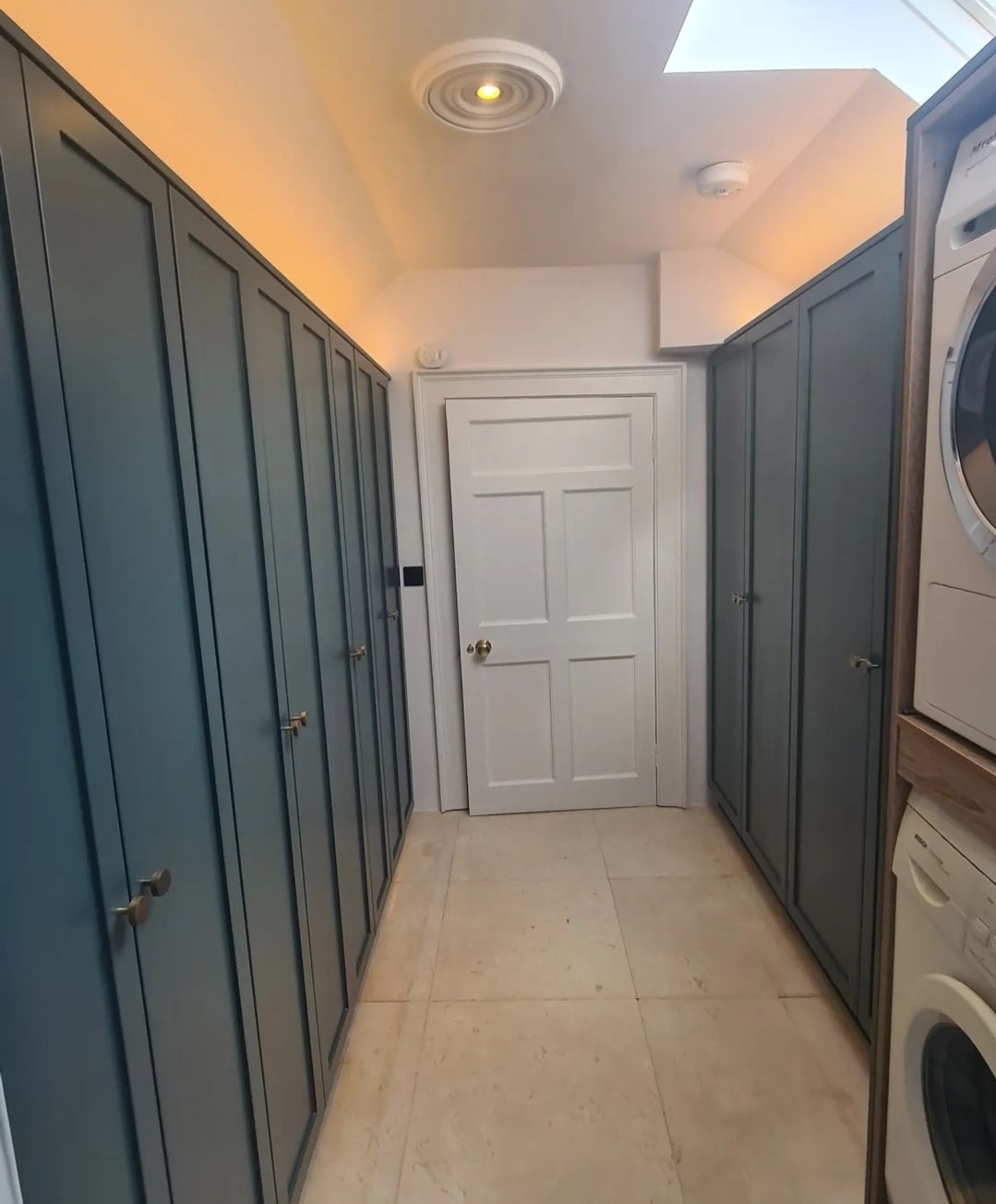 Modern Form Kitchens designed, built and installed this stylish and functional utility room in the upper floor of this Georgian house. The doors were custom made and sprayed with a washing machine, dryer unit, drying rack, drawers and shelving spaces.