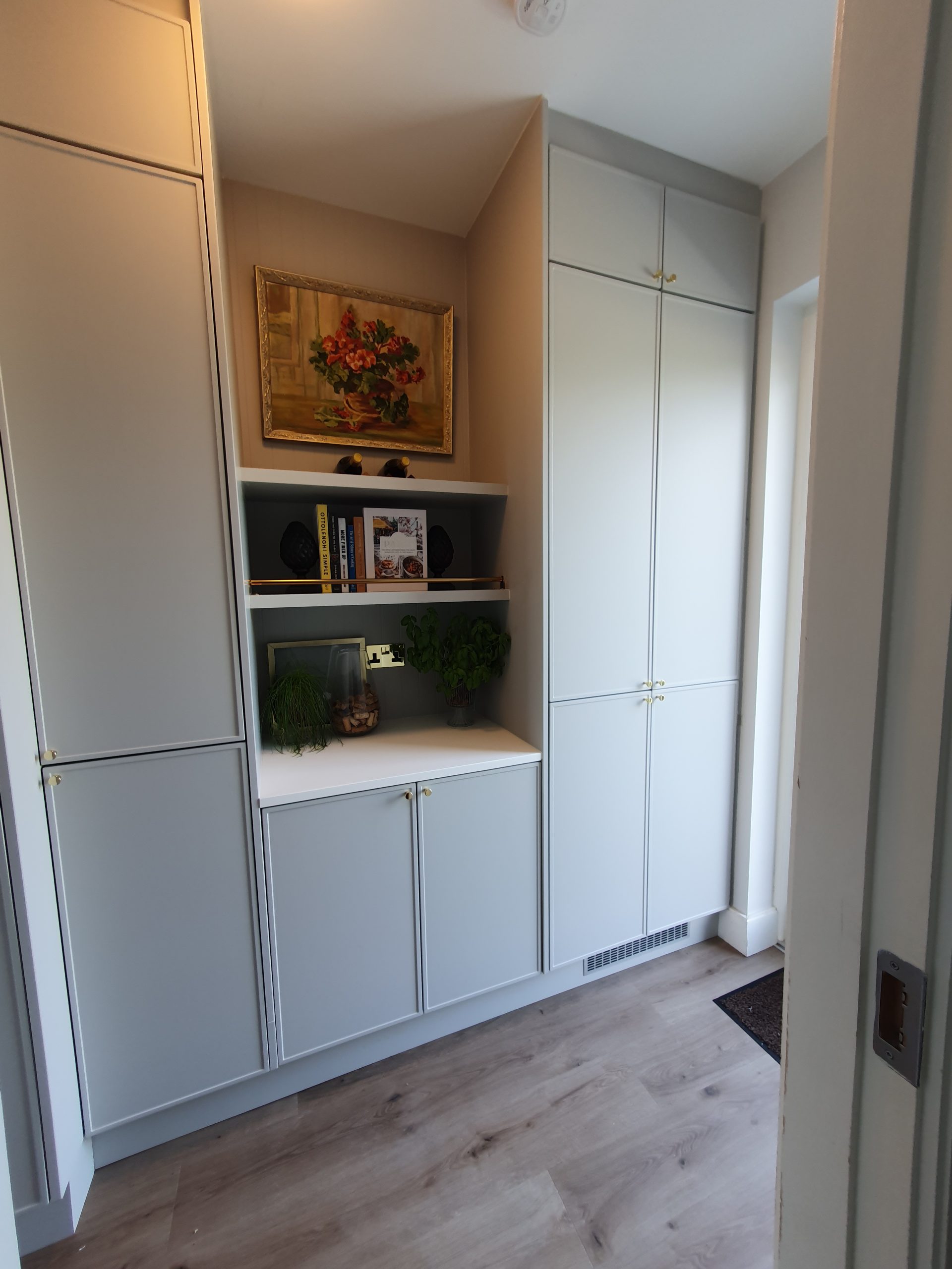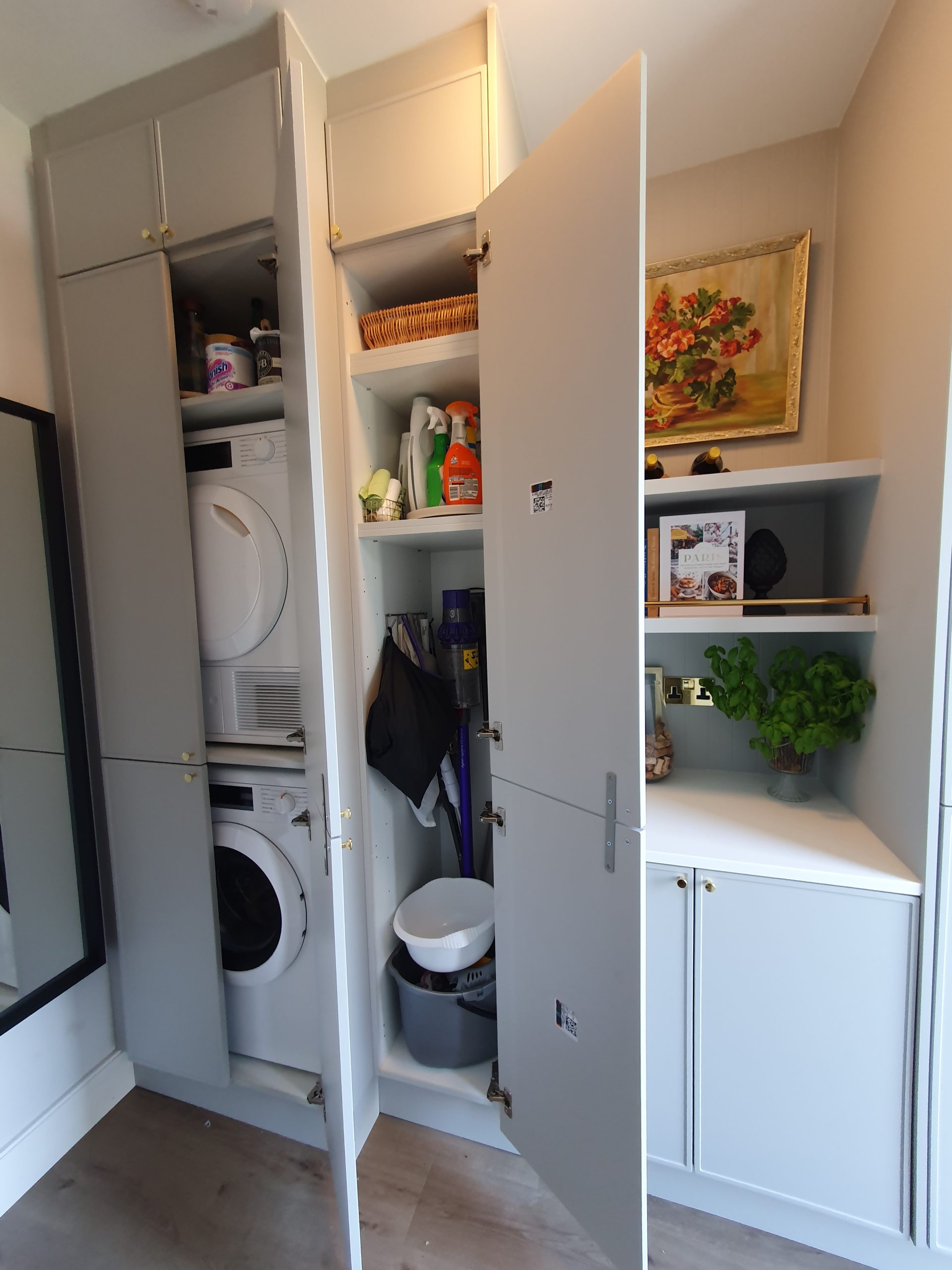 Modern Form Kitchens completed this beautiful and sleek utility room in Foxrock Dublin in 2024. MFK used OS Doors Vilo style to create a sleek and stylish utility with a stacked washing machine and dryer with 180 degree hinges for easy access.