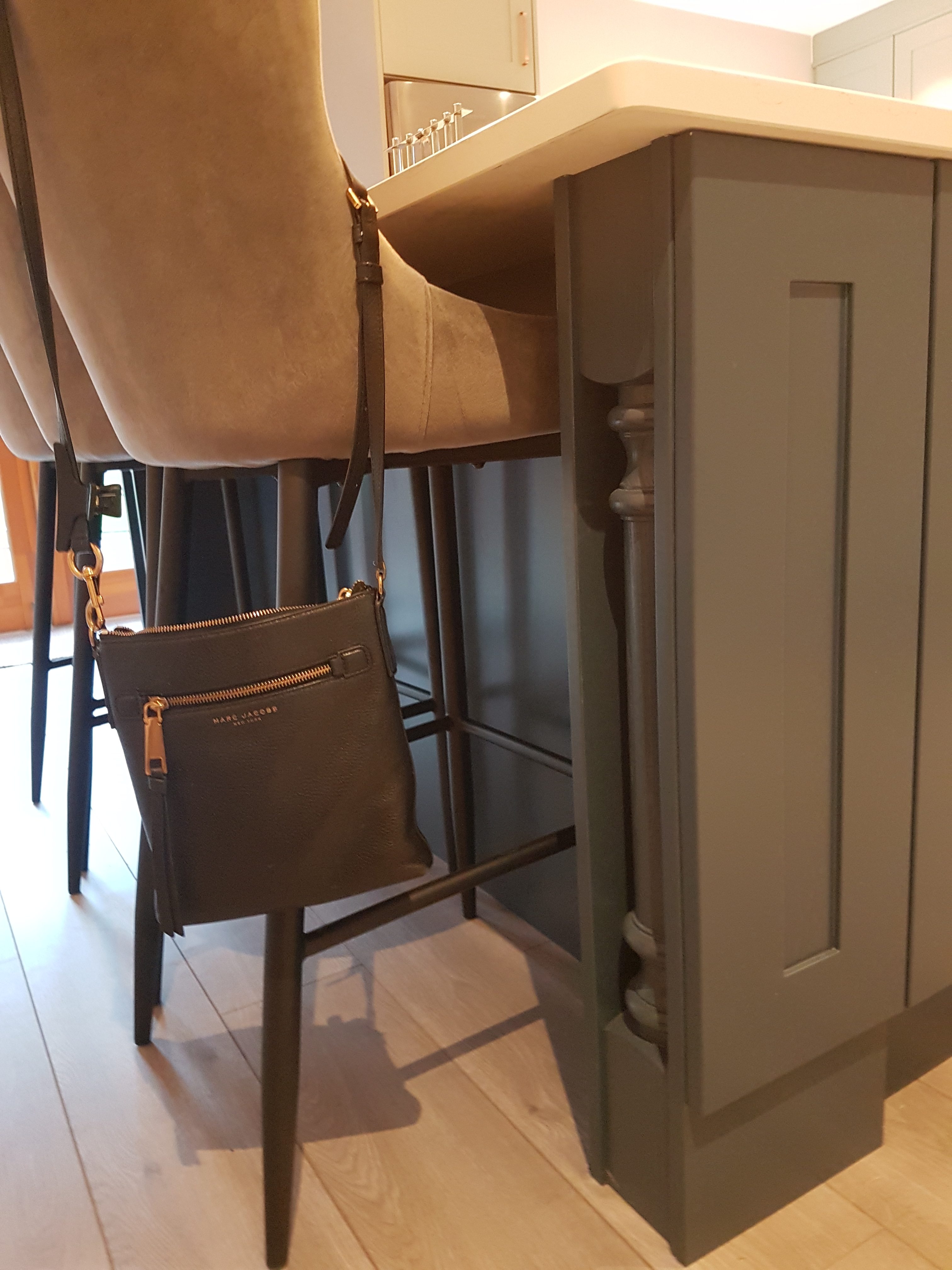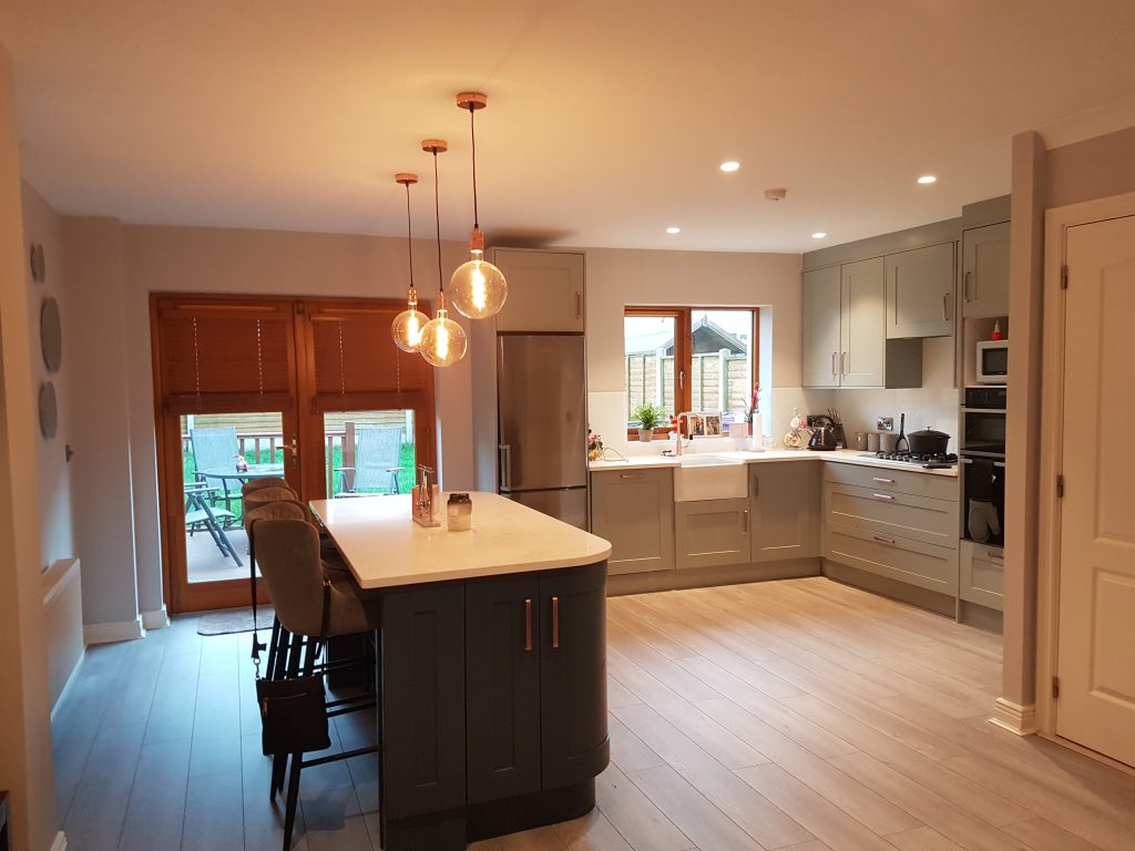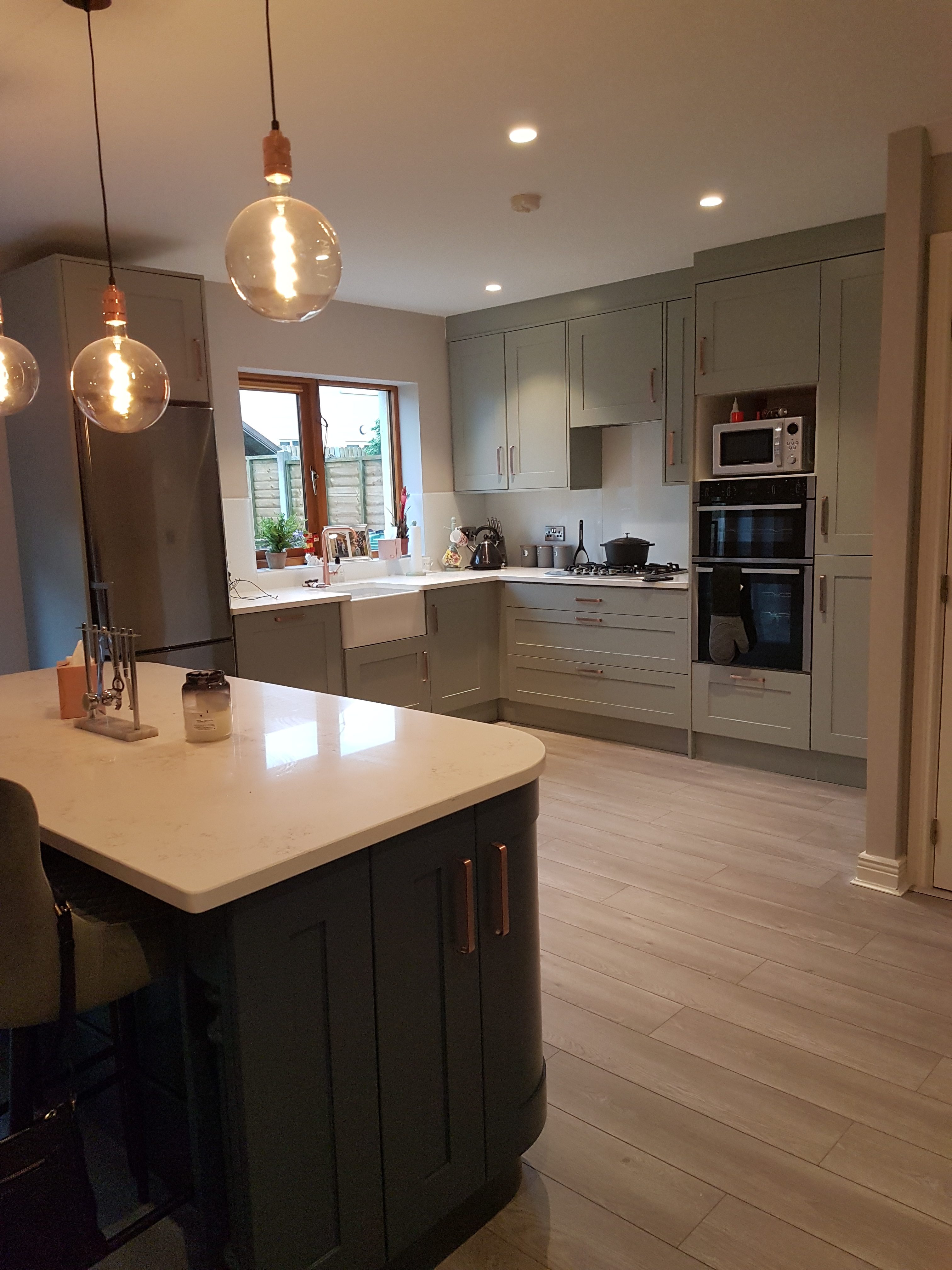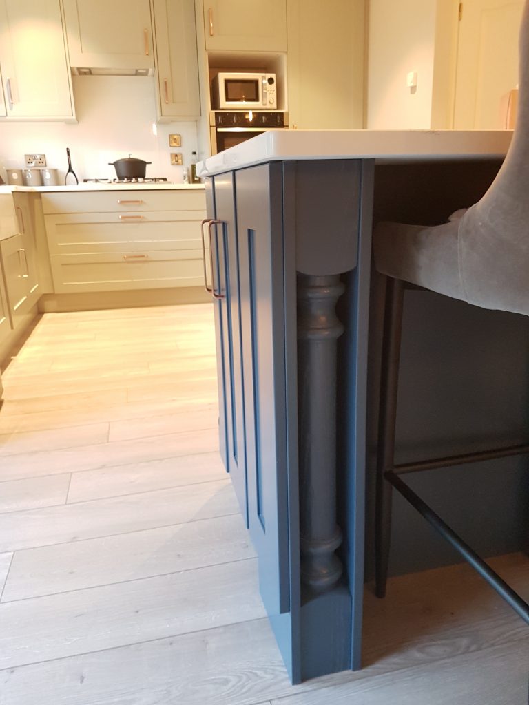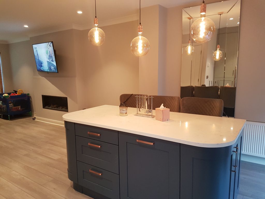 This kitchen really stands out with its Blue Curved Island and grey main kitchen. The curved doors at the front are matched by the posts at the back to frame the breakfast bar. The counters are white quartz fitted by De Bros