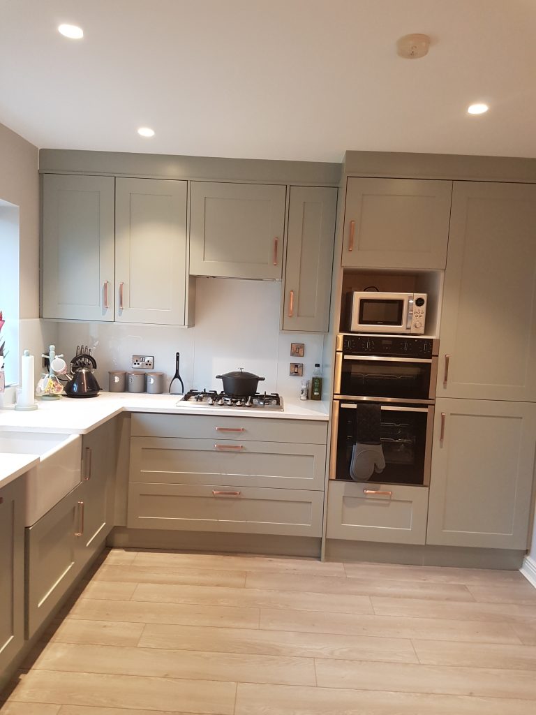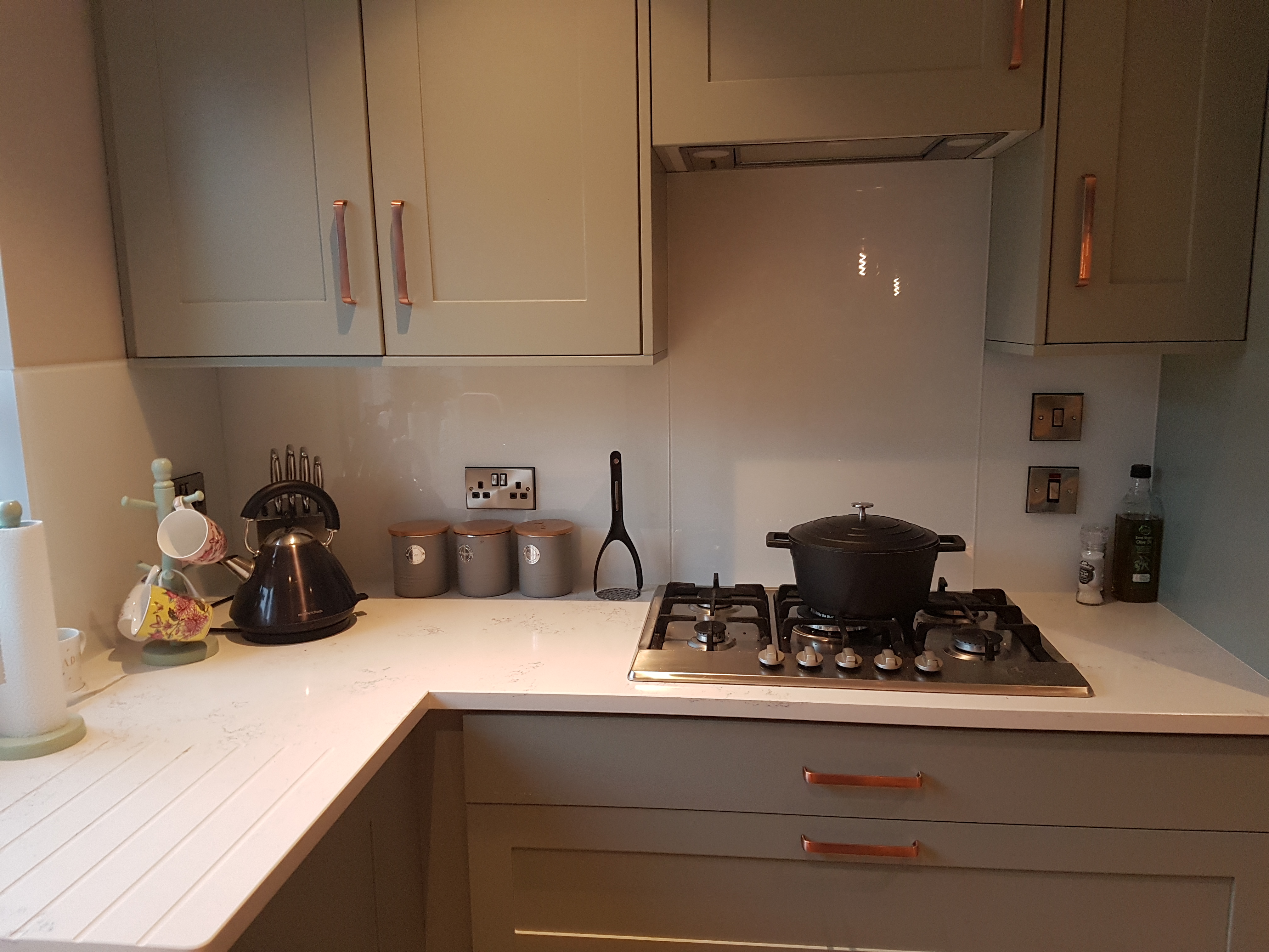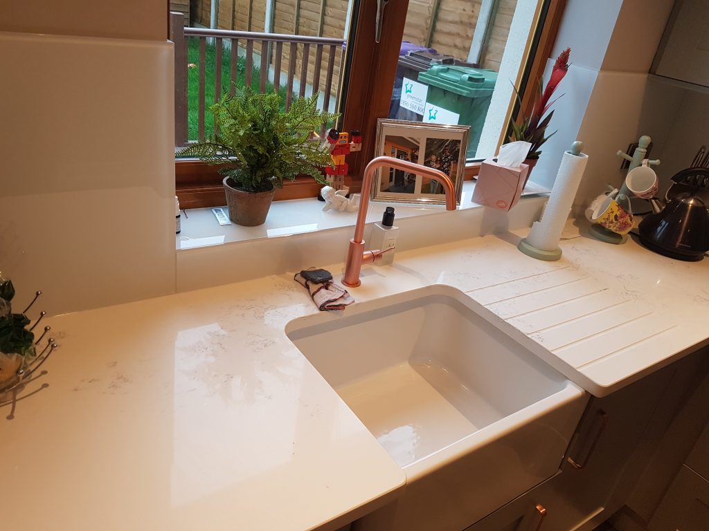 The sink is a Belfast sink with a gas hob and glass spalshback to finish it off.
