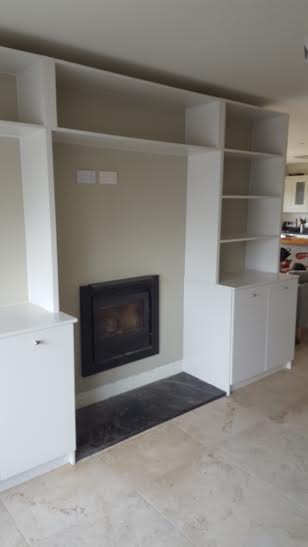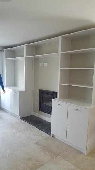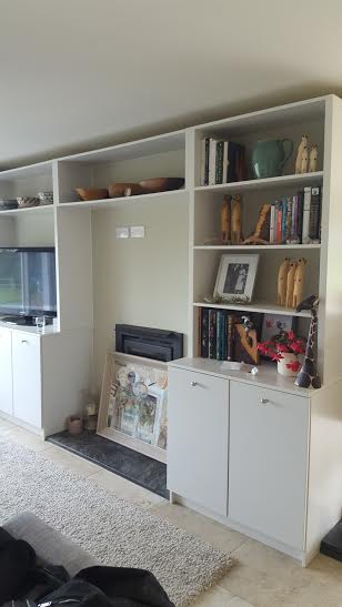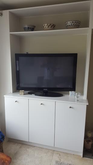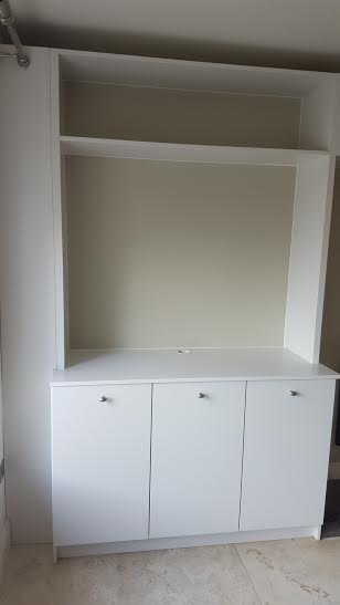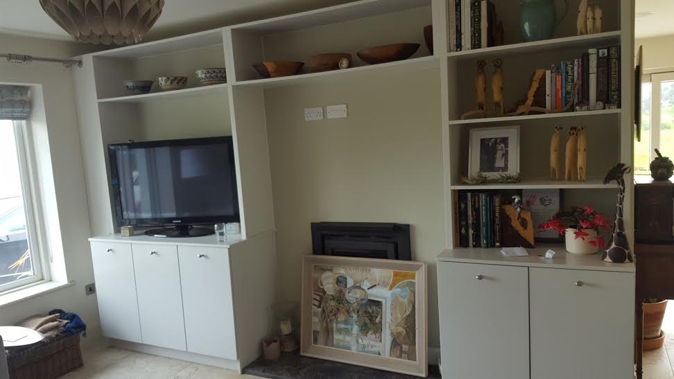 This TV unit Farrow and Ball Brilliant white. It also has book shelves and deep bin drawers for firewood on one side and shelves on the other base unit.